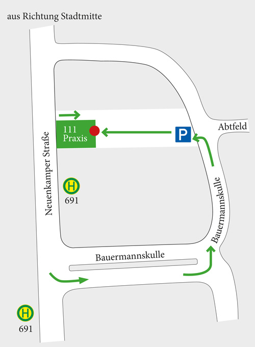 Von der Neuenkamper Straße stadtauswärts kommend nach links, stadteinwärts nach rechts in die „Bauermannskulle“ einbiegen, an der nächsten Möglichkeit links fahren und nach ca. 50 Metern (gegenüber der Einmündung „Abtfeld“) finden Sie den Stellplatz auf der linken Seite.